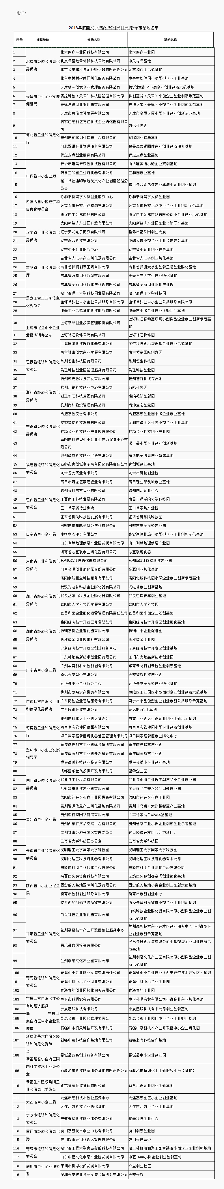 工业和信息化部公布2018年度国家小型微型企业创业创新示范基地名单